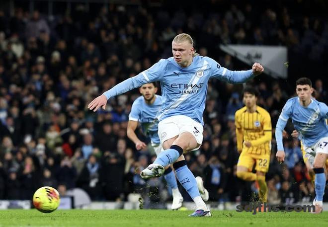 英超第21轮,曼城主场对阵布莱顿,上半场哈兰德主罚点球破门,打入曼城生涯第150球,只用了173场。