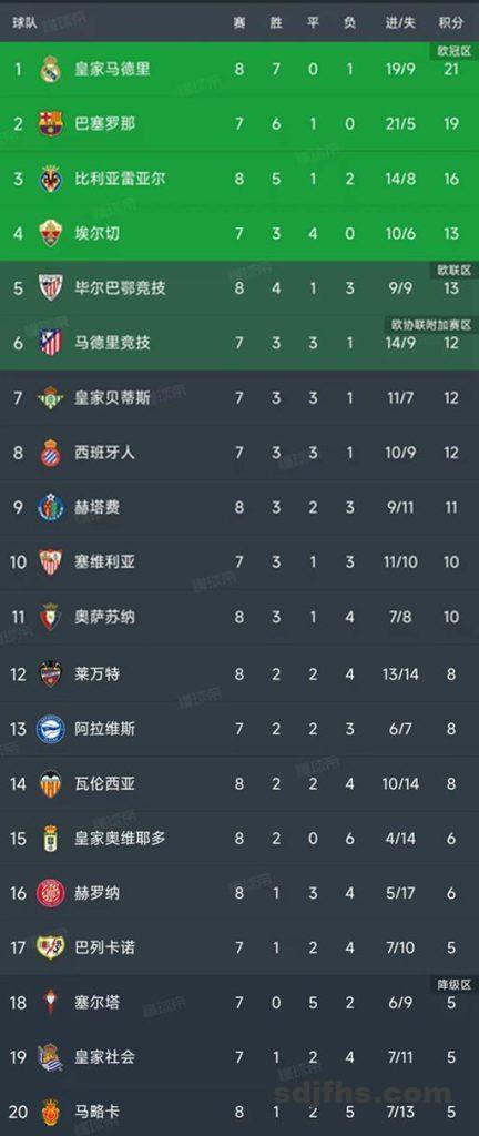 北京时间10月5日,西甲第8轮率先结束了5场比赛,最新积分榜如下!