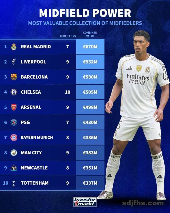 德国转会市场网站列出了球队中场球员总身价排行榜,皇家马德里以6.7亿欧居首,利物浦以5.32亿欧排名第二,巴塞罗那以5.3亿欧位列第三。