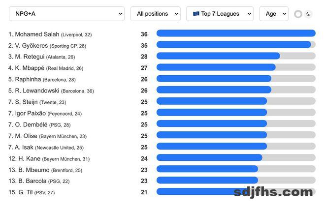 DataMB网站统计了本赛季七大联赛(英超、西甲、意甲、德甲、法甲、葡超、荷甲)中。进球(无点球)+助攻排名,萨拉赫以36球名列榜首,哲凯赖什、雷特吉分列二、三。