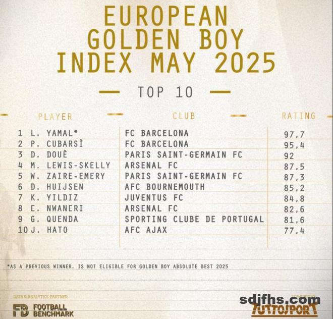 北京时间5月29日,据《都灵体育报》发布的2025年欧洲金童奖5月份最新排名,巴萨前锋亚马尔排在首位,但由于他去年已经获得该奖项,因此无法再次获奖,目前排在第二的是巴萨后卫库巴西,大巴黎球员杜埃紧随其后。