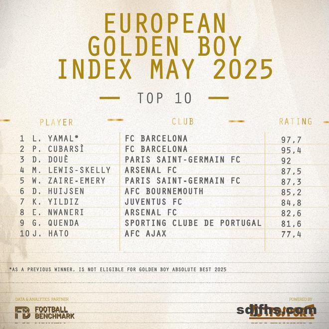 北京时间5月29日,据《都灵体育报》发布的2025年欧洲金童奖5月份最新排名,巴萨前锋亚马尔排在首位,但由于他去年已经获得该奖项,因此无法再次获奖,目前排在第二的是巴萨后卫库巴西,大巴黎球员杜埃紧随其后。