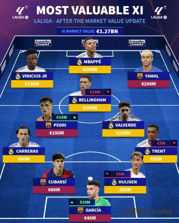 北京时间3月16日,德转更新了新一期西甲球员的身价,随后德转也是列出了西甲联赛在433阵型下的最贵阵容,皇马和巴萨包揽了全部十一个位置。