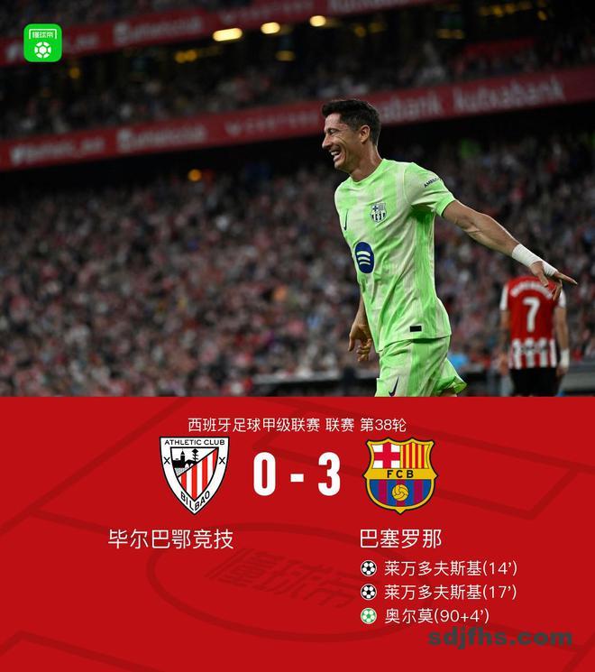 西甲第38轮,巴塞罗那客场3-0击败毕尔巴鄂竞技,此役上演梅开二度的巴萨前锋莱万当选西甲官方全场最佳球员。
