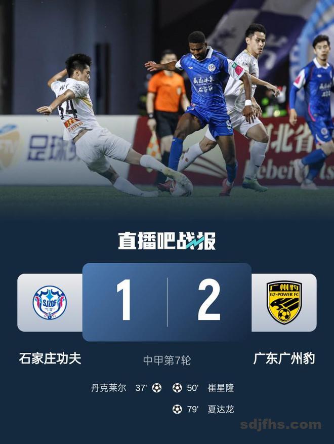 直播吧5月4日讯 北京时间5月4日晚上19:30,中甲第7轮,石家庄功夫坐镇裕彤国际体育中心迎战广州豹。上半场,罗萨远射造威胁+染黄,丹克莱尔撞射破门。下半场,崔星隆包抄扳平,夏达龙头槌反超。全场比赛结束,石家庄功夫1-2广州豹。本场过后,石家庄功夫4胜2平1负积14分排名第四,广州豹5胜1平1负积16分升至第三。