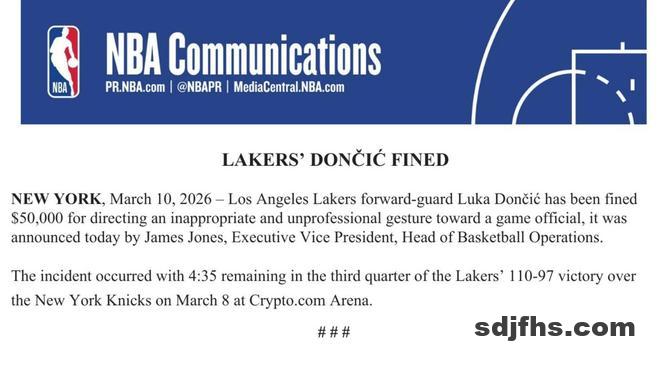 北京时间3月11日,NBA官方宣布,东契奇因在对阵尼克斯的比赛中对裁判做出数钱的手势,被罚款5万美元。