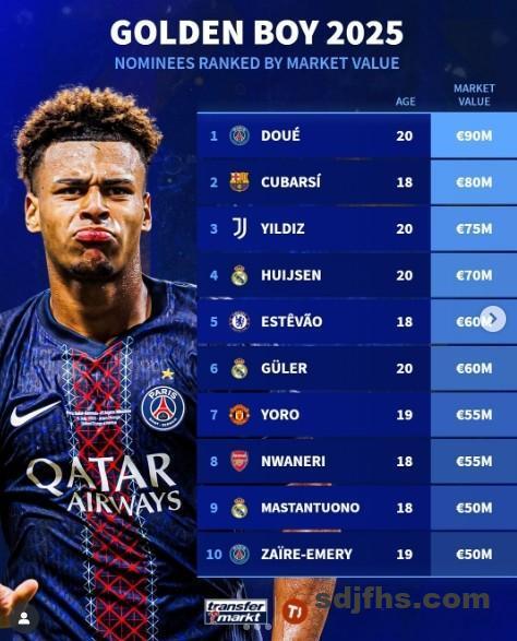 北京时间10月16日,《都灵体育报》公布了2025年金童奖25人候选。在名单公布后,德国转会市场对他们的身价进行了排名。大巴黎球员杜埃以9000万欧的身价高居榜首。