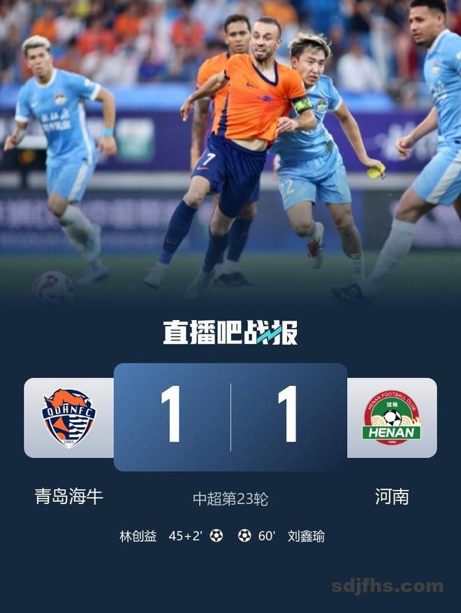 直播吧8月29日讯 北京时间8月29日19:00,中超第23轮,青岛海牛坐镇青岛青春足球场迎战河南队。上半场,阿奇姆彭进球越位在先,王国明奉献神扑,林创益补时破门;下半场,纳萨里奥助攻,刘鑫瑜凌空打门扳平比分。最终,青岛海牛1-1战平河南队遭遇3轮不胜,先赛一场积16分仍居第15位,落后保级区1分,河南队积23分暂居第11位。