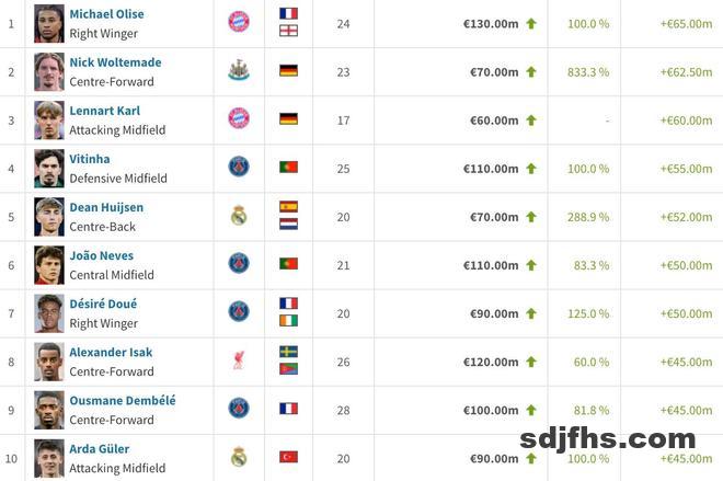 北京时间12月25日,德转统计出了2025年身价涨幅最高的25名球员,拜仁慕尼黑边锋奥利塞过去一年里身价暴涨6500万欧元排名所有球员第一,沃尔特马德上涨6250万欧元第二,伦纳特-卡尔上涨6000万欧元第三。