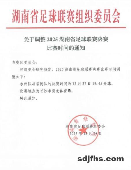 根据湖南省足球联赛(简称“湘超”)组委会发布的通知,2025“湘超”决赛永州队vs常德队的比赛时间调整到12月27日(本周六)晚19:45开球。(注:原计划开球时间是12月27日下午15:00)