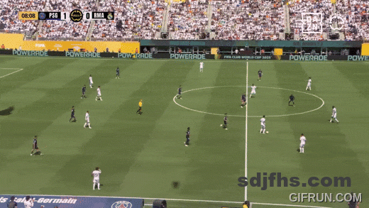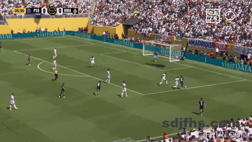 杜埃在肋部穿插,皇马左半边防守去围杜埃,于是中路大乱,失误,被巴黎首开纪录,1比0。