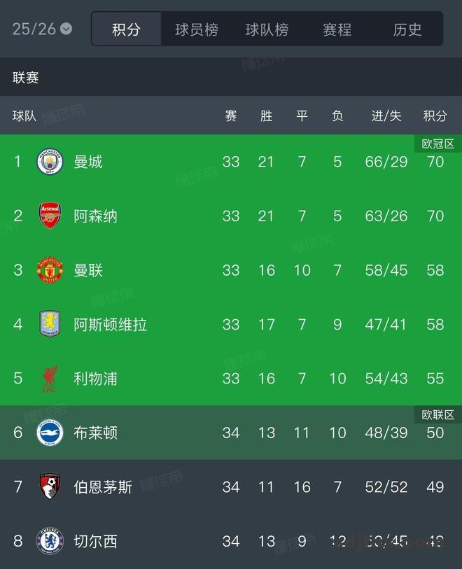 曼城本赛季在少赛一轮的情况下一度落后榜首阿森纳9分,随着阿森纳在联赛进入4月后连续不敌伯恩茅斯和曼城,积分优势已缩小至3分。本轮曼城战胜伯恩利全取3分,两队积分差距被抹平。