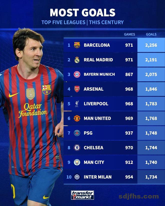 北京时间6月27日,德国转会市场列出了21世纪五大联赛进球最多的十支球队,其中巴塞罗那位列榜首,皇马、拜仁分列二三。