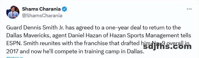 北京时间9月19日,据名记Shams报道,后卫小丹尼斯-史密斯已同意与达拉斯独行侠队签下一份为期一年的合约,重返老东家效力。
