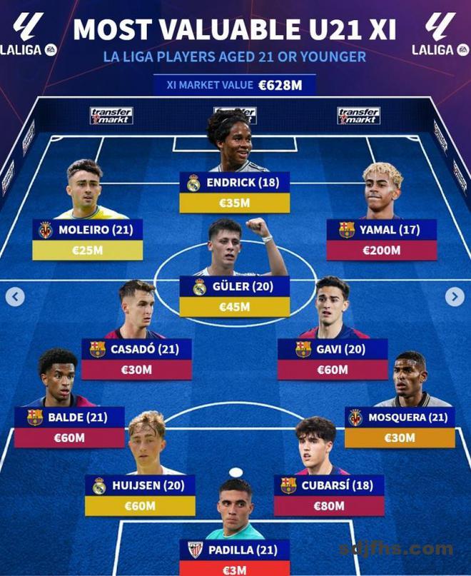 德转列西甲U21最贵阵:总身价6.28亿欧元