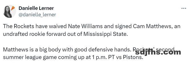 北京时间7月14日,火箭官方宣布一签一裁,23岁防守悍将卡梅伦-马修斯被签下,而内特-威廉姆斯被裁。