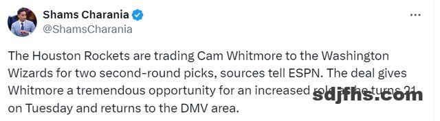 北京时间7月6日,据名记Shams报道,火箭队已同意将前锋卡姆-惠特莫尔交易至奇才队。Shams透露,火箭将换回两个次轮选秀权作为回报。后续报道更新,这两个次轮是2026年公牛的次轮签和2029年国王的次轮签。
