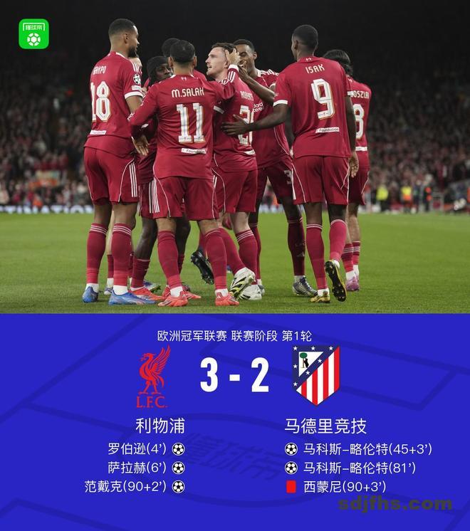 北京时间9月18日,欧洲冠军联赛联赛阶段第1轮展开较量,利物浦迎战马德里竞技。比赛伊始,萨拉赫送出助攻,罗伯逊破门为利物浦取得领先。随后不久,赫拉芬贝赫送出传球,萨拉赫攻入一球,将比分扩大。上半场补时阶段,拉斯帕多里助攻马科斯-略伦特扳回一城。第81分钟,马科斯-略伦特再度破门,帮助马德里竞技将比分追平。下半场补时第2分钟,索博斯洛伊送出助攻,范戴克头球破门,利物浦重获领先。比赛尾声,马德里竞技主教练西蒙尼被红牌罚下。最终全场比赛结束,利物浦3-2战胜马德里竞技。