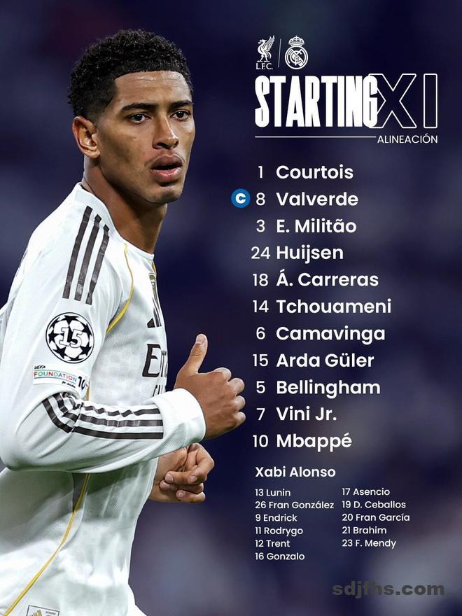 皇家马德里首发:1-库尔图瓦、18-阿尔瓦罗-卡雷拉斯、24-赫伊森、3-米利唐、8-巴尔韦德、6-卡马文加、14-楚阿梅尼、5-贝林厄姆、7-维尼修斯、15-居莱尔、10-姆巴佩