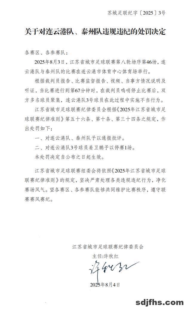 连云港队与泰州队发生冲突,江苏省城市足球联赛纪律委员会发布处罚决定