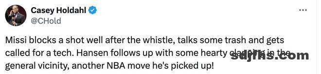 “米西说垃圾话被吹技术犯规,杨瀚森在一旁鼓掌,这是他进入NBA之后学会的招式。”