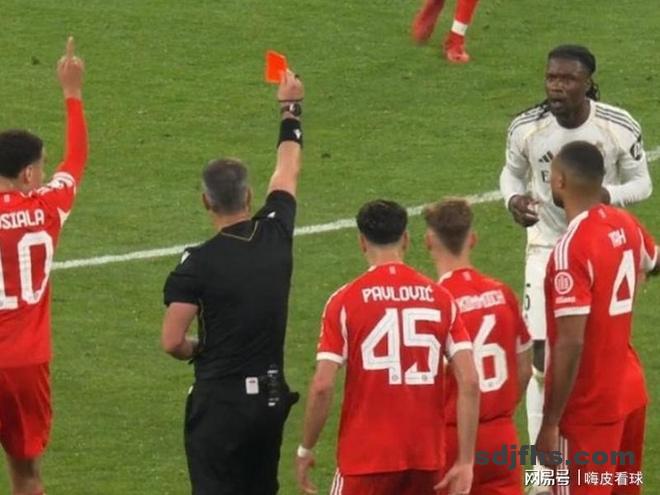 随后,两队各进两球,拜仁上半场一球落后,总比分为4-4,皇马看到了晋级的希望。可惜的是,卡马文加毫无必要的拖延时间动作,领到黄牌,裁判第一时间没有意识到,这是皇马中场本场比赛的第二张,似乎在拜仁球员的提醒下,才出示了红牌。