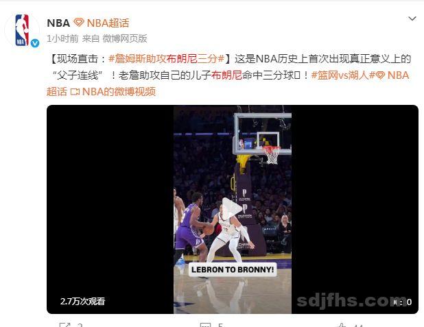 詹姆斯与布朗尼上演NBA历史首次父子之间助攻好戏,也是让NBA官方分享该瞬间,并且给出夸赞。