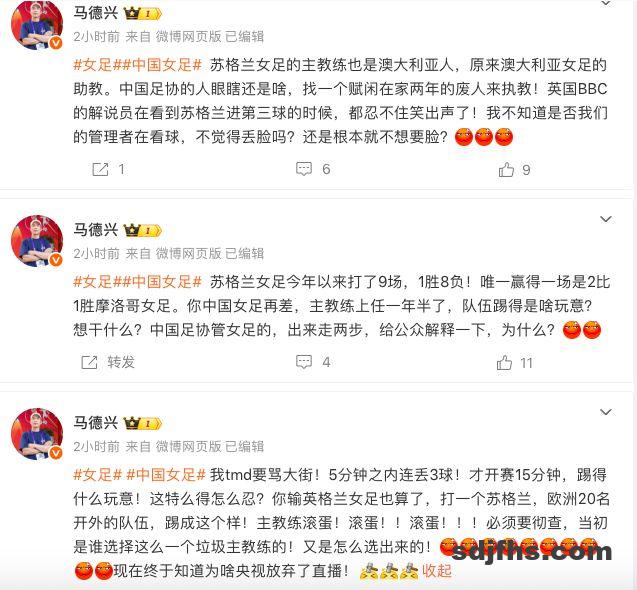 马德兴写道:“你输英格兰女足也算了,打一个苏格兰,欧洲20名开外的队伍,踢成这个样,主教练滚蛋!中国足协管女足的,出来走两步,给公众解释一下,为什么?必须要彻查,当初是谁选择这么一个垃圾主教练的?又是怎么选出来的,现在终于知道为啥央视放弃了直播!”