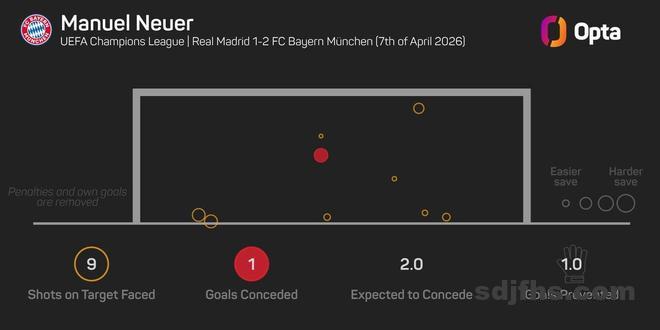 自从Opta开始进行详细数据统计以来,诺伊尔是第一位在伯纳乌球场对阵皇家马德里的欧冠淘汰赛中完成9次扑救的门将。