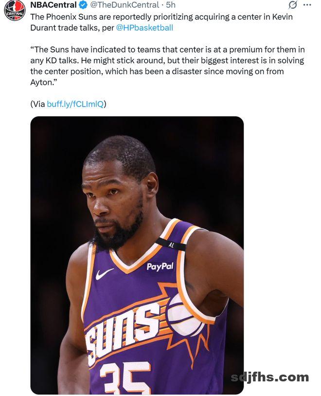 不过,太阳向各支球队表明,在任何有关于杜兰特的谈判中,中锋对他们来说都是非常重要的。杜兰特或许会留在球队,但是他们最关心的是要解决中锋位置的问题,自从放走艾顿后,这个位置一直是个灾难。因此,在杜兰特的交易谈判中,菲尼克斯太阳队优先考虑获得一名中锋。