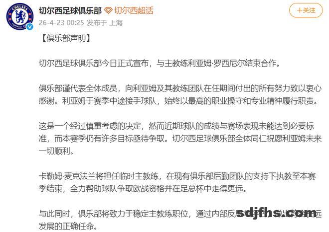 切尔西在公告中这样写道:“做出这一决定(换帅)并非俱乐部轻率之举,然而最近的比赛结果和球队表现未能达到应有的标准,而本赛季仍有大量重要比赛等待我们去完成。切尔西足球俱乐部的全体成员祝愿罗塞尼尔在未来一切顺利。此外,卡勒姆-麦克法兰将担任临时主教练,带领球队直至本赛季结束,并由俱乐部现有教练组成员协助。我们将继续努力争取获得欧洲赛事资格,并在足总杯中取得进步。在俱乐部为主教练职位寻求稳定人选的过程中,我们将进行自我反思,以做出正确的长期任命。”
