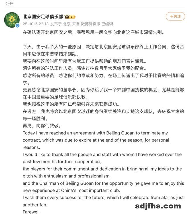 新京报讯 据@北京国安足球俱乐部 消息,在确认离开北京国安之后,塞蒂恩用一段文字向北京这座城市深情告别。