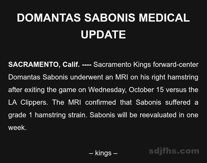 萨博尼斯在季前赛输给快船的比赛中因腿筋问题离场,随后在周五晚上洛杉矶的季前赛收官战中,他因接受检查而缺席。这被认为是一次轻微的拉伤,但萨博尼斯将无法在国王队对阵太阳队的赛季揭幕战,以及对阵爵士队的主场揭幕战中出场。他最早可能在10月27日对阵湖人队的比赛中回归。