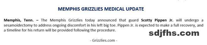 灰熊队官方宣布,后卫小斯科蒂-皮蓬将因左脚大脚趾受伤接受手术,据消息人士透露,他将在12周后重新接受评估。灰熊队表示,小皮蓬将接受籽骨切除术以处理他们所说的“持续不适”,预计他将完全康复。
