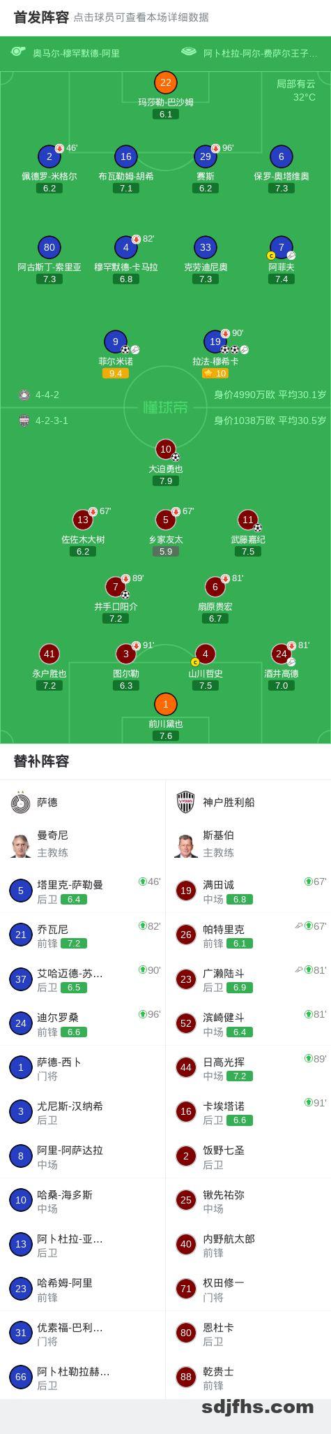 第65分钟,萨德反击,菲尔米诺抢点破门扩大比分,萨德3-1神户