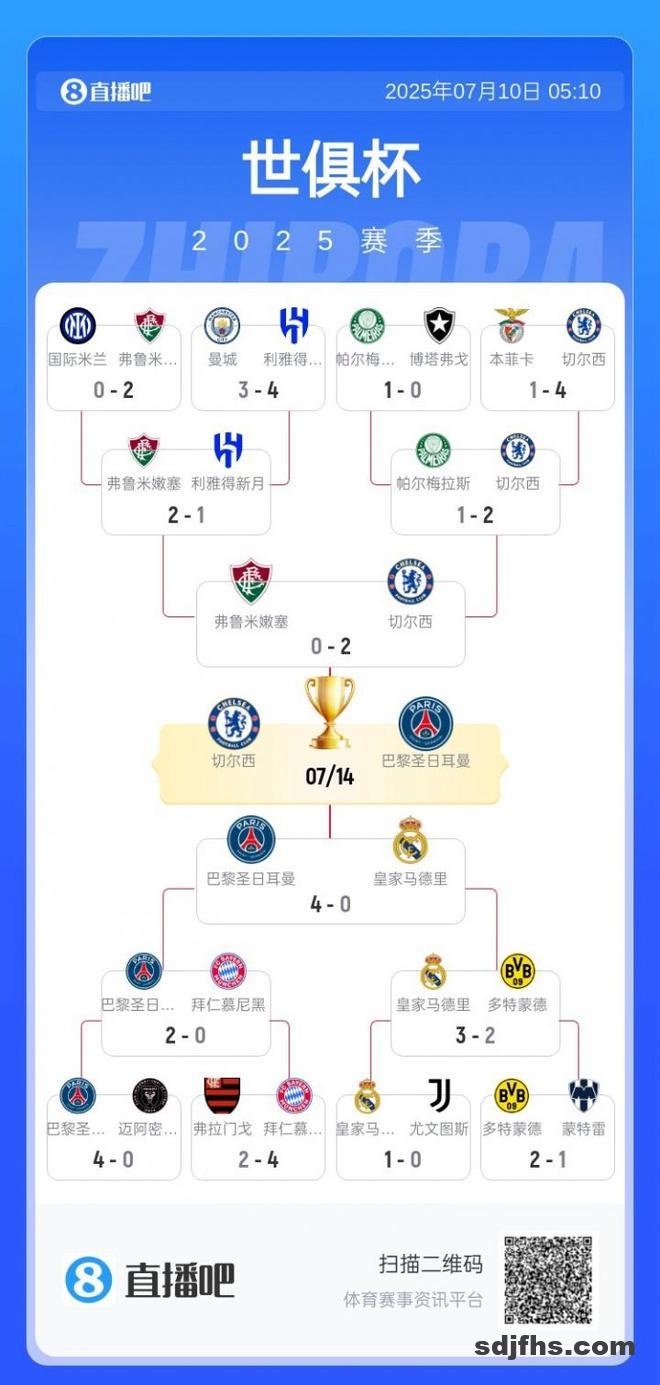 直播吧7月10日讯 世俱杯半决赛,巴黎4-0大胜皇马,决赛将战切尔西。