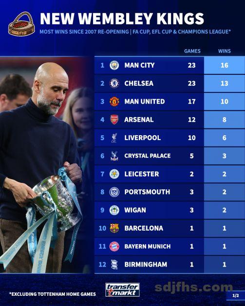 蓝月军团造访新温布利23次,赢了其中16场。这段时间他们拿了三个足总杯、七个联赛杯。