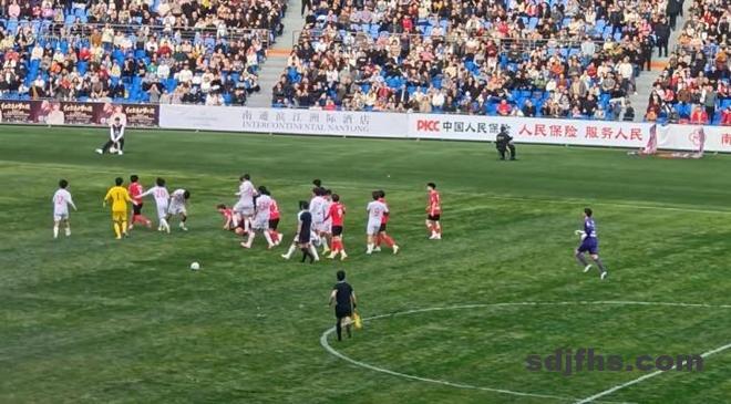 从视频中可以看到,身穿红色球衣的南通队球员,在一次中圈附近拼抢放倒身穿白色球衣的海港U21球员,或许是犯规动作有些大,这引发了海港U21队方面的强烈不满。