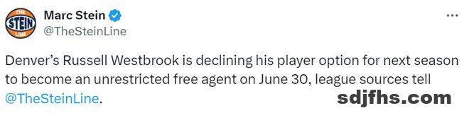 北京时间6月13日,据名记Stein报道,掘金后卫的拉塞尔-威斯布鲁克将拒绝执行下赛季的球员选项,并于北京时间7月1日成为完全自由球员。