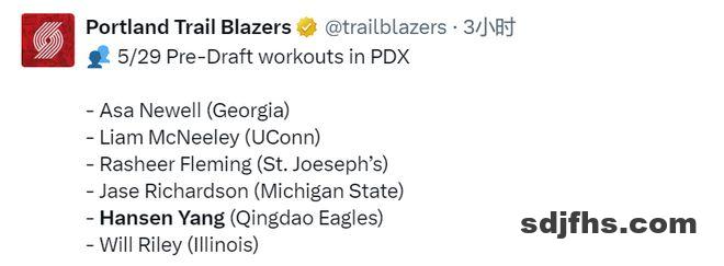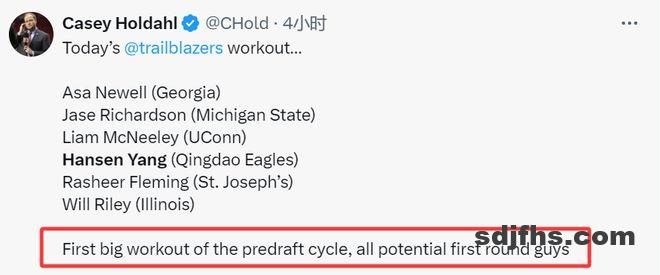 开拓者多位队记报道了球队的首日试训名单,并表示名单上的球员都是潜在的首轮秀。毫无疑问,杨瀚森在联合试训的表现已经征服不少人,选秀行情看涨,在不少球队记者眼中,他是有可能在首轮被选中的球员了。