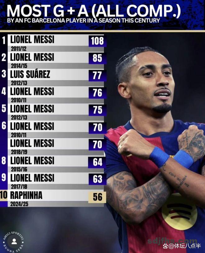 这两份数据榜单展现出极强的个人统治力——梅西包揽了进球榜前十中的八席、进球+助攻榜前十中的八席,而他的单赛季73球与108项“进球+助攻”纪录远超任何队友和后来者。只有苏亚雷斯、莱万多夫斯基和拉菲尼亚进入过这两个榜单,且进球总数与梅西顶峰赛季存在明显差距,苏亚雷斯54球与梅西73球、Raphinha 56项与梅西108项差距几乎翻倍。