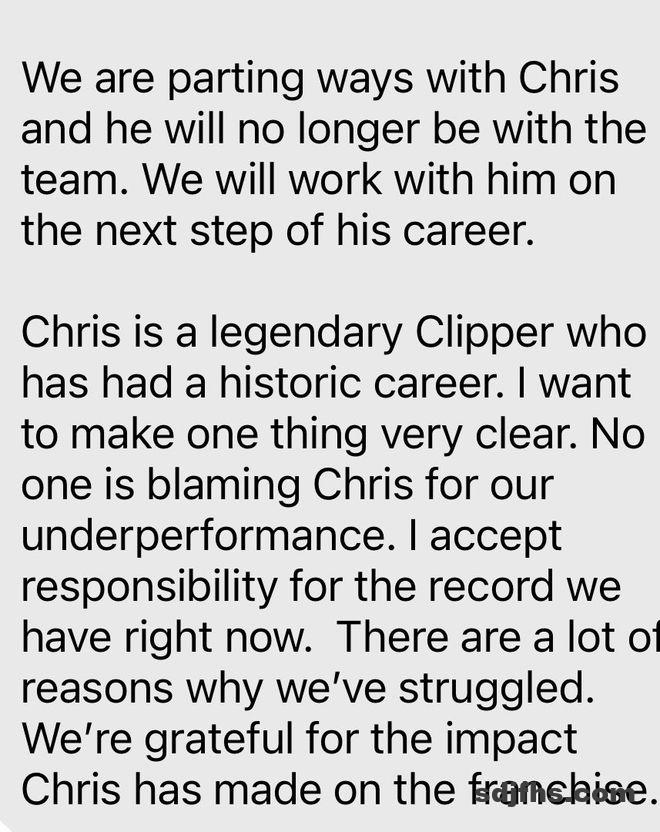 北京时间12月3日,快船通过TA宣布与保罗分手:“我们决定与克里斯分道扬镳,他将不再为球队效力。我们会协助他规划职业生涯的下一站。克里斯是快船队的传奇,他的职业生涯已载入史册。我想明确一点:没有人会将球队的低迷表现归咎于克里斯。我会为球队当前的战绩承担责任。球队陷入困境的原因有很多。我们由衷感谢克里斯为球队带来的深远影响。”
