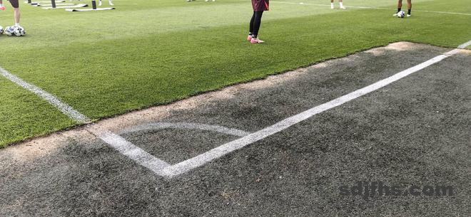 虽说训练场的草皮条件不错,但比较遗憾的是,这块场地的一角有“残缺”,一个角球区附近的位置没有草皮覆盖,这是比较少见的情况。