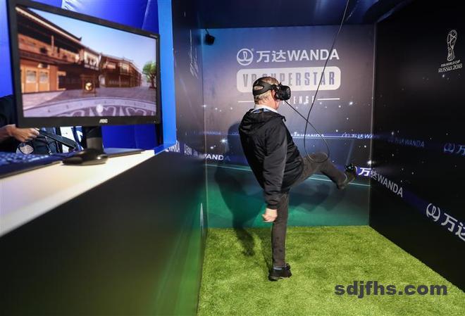2018年7月8日,一名媒体记者在莫斯科卢日尼基体育场外的万达VR互动中心体验VR足球挑战项目。 当日,万达集团在莫斯科卢日尼基体育场外举办媒体开放日活动,向中外媒体介绍万达集团与国际足联的合作及与俄罗斯世界杯相关的情况。国际足联与万达集团于2016年签订战略合作协议,万达成为中国首个国际足联顶级赞助商,协议有效期15年。 新华社记者单宇琦摄